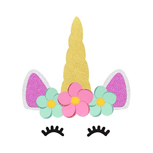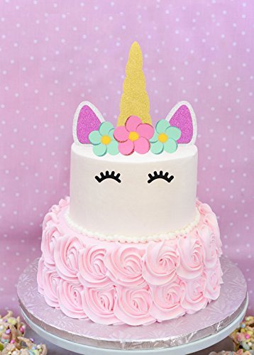 - Cake topper kit includes 1 horn, 2 ears, 2 eyes, 2 blusher dots, 3 flowers . Cake topper horn is 1.2 inches wide x 4.2 inches tall and ears are 1. 2 inches wide x 2. 1 inches tall. The picks are 2.1 inches long. Ideal for an 8 to 10 inch cake to celebrate a your child's unicorn birthday!