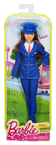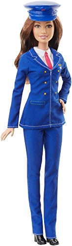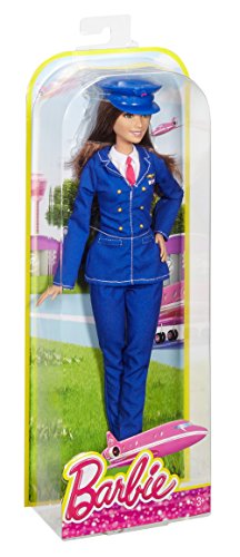 - Barbie pilot doll reaches new heights in a stylish blue pilot pants uniform with red tie detail and signature emblem