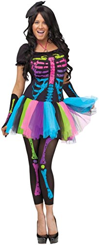 -. Binding : Apparel -. Brand : Fun World -. Color : Multicoloured -. Department : womens -. Feature : Includes dress with black top with printed neon-colored ribcage, neon rainbow tulle skirt, matching sleevelets and footless tights. / Please note hairpiece, necklace and shoes are not included. / Available in adult sizes Small/Medium (2-8). -. ProductGroup : Apparel -. ProductTypeName : DRESS -. Title : Funky Punk Bones Adult Costume