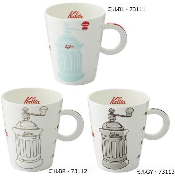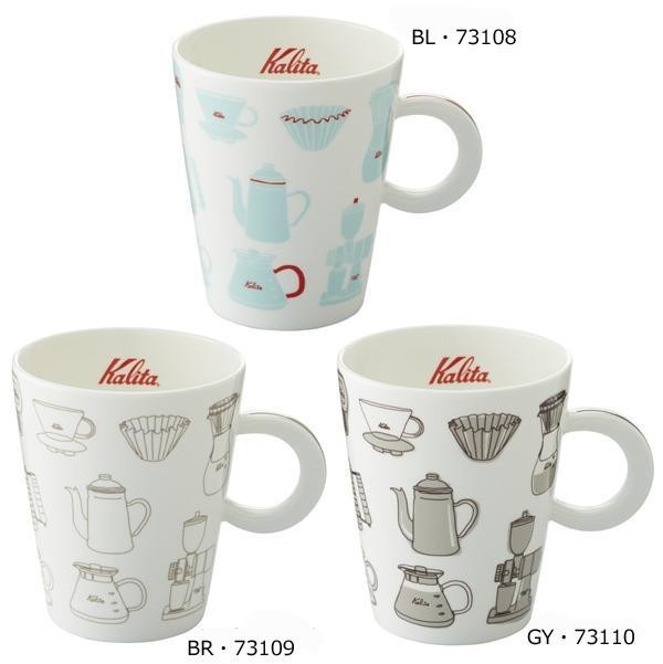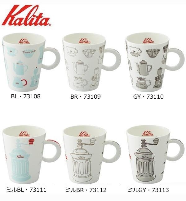 手挽きコーヒーミルやポットなど、カリタのコーヒーグッズが可愛いイラストで描かれたマグカップです。 |