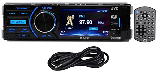 -. Feature : JVC KD-AV41BT 3" Single-Din Car Stereo with Bluetooth, DVD and USB. DVD/CD receiver with AM/FM tuner. Built-in internal amp (22 watts RMS/50 peak x 4 channels) / 3" fold-down detachable QVGA display with blue illumination. Fits single-DIN dash openings. Remote control / Built-in Bluetooth for hands-free calling and wireless audio streaming. Built-in iPod, iPhone, and iPad control / Front USB input. Front A/V input. Rear-view camera input. Rear video output. 2-channel preamp outputs (2-volt rear/sub) / 3.5 MM to 3.5 MM Aux Input Cable. 6 Feet. Pure Connection. P-Text. Allows you to hook up an Ipod or MP3 player to any stereo with a 3.5 MM Aux Input