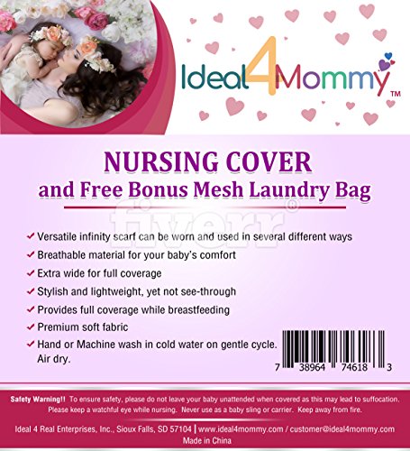 -. Feature : WHILE OTHER NURSING COVERS AND SCARVES are of very thin see-through fabric, or not breathable, get too hot and shrink when washed, the Ideal4Mommy Infinity Nursing Scarf, HAS PLENTY OF ROOM FOR BOTH MOMMY AND BABY and is made with BREATHABLE FABRIC that will NOT OVERHEAT THE BABY and NEVER SHRINKS when washing per care instructions. This means you and your newborn will be STYLISH and COMFORTABLE when nursing in public. COMES WITH ADDED GIFT OF A MESH LAUNDRY BAG FOR DELICATES. / PERFECT GIFTS FOR BABY SHOWER - One of the most appreciated gifts by nursing mothers by survey. No need worrying if it is the trend, will it be useful and appreciated. Can be worn as a PREMIUM STYLISH SCARF and OFFERS COMFORT AND P.R.IVACY when nursing in public! Keep bright sunlight off the baby as it cover ups, stretches and PROTECTS YOUR CHILD from the elements and nosy people touching your baby / WHETHER IN A CAR, SHOPPING, WALKING WITH A STROLLER, IN A PARK OR A RESTAURANT - you will have peace of mind knowing our lightweight cover will keep your child safe from mosquitoes, bugs, bacteria, germs, sun, wind, breezes. All the while providing full P.R.Ivacy and comfort when nursing in public so OUTINGS CAN BE CARE-FREE AND ENJOYABLE / WE AT IDEAL 4 MOMMY BELIEVE in helping busy moms by making it easier to enjoy outings with their children and creating happier families. We are a big family and believe in and use our own products. We expect the best for our family and want the same for yours / We believe so much in our products that we offer an UNCONDITIONAL MANUFACTURER LIFETIME SATISFACTION GUARANTEE: If ever anything goes wrong or our Infinity Nursing Scarf is not to your liking we offer an unconditional, hassle-free replacement or refund; Completely risk-free satisfaction guarantee