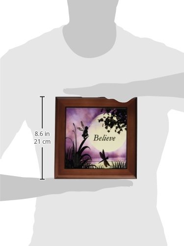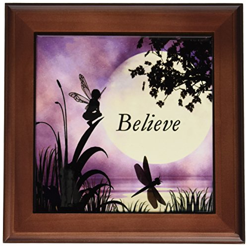 3dRose ft_35696_1 Believe, Fairy with Dragonflies with Moon and Purple Sky Framed Tile, 8 by 8-Inch