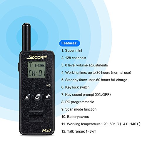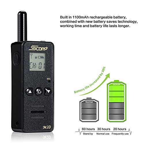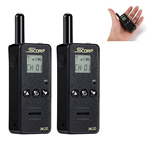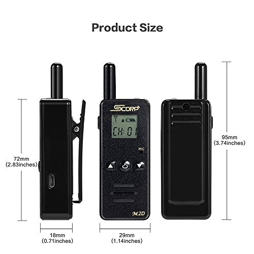 - [Super Mini] SCORP M2D is a super mini design walkie talkie, only 3.74 x 1.14 x 0.71 in, 50 g, 1.76 oz. You can put it in your handbag, pocket, purse and other bag, lightweight, convenient and easy to carry, super mini and cute.