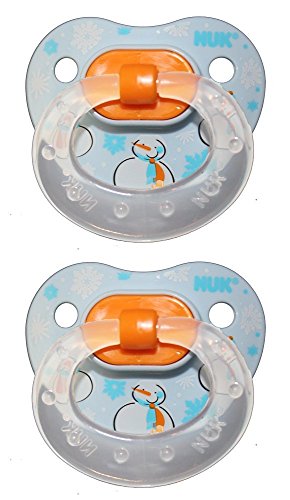 Nuk Holiday Silicone Orthodontic Pacifiers- 6+M Features the Nuk Air System Silicone Nipple BPA Free May Help reduce the risk of SIDS Blue Snowman- 2 Pack- A fun holiday pattern featuring a blue background with white snowman wearing scarfs and snowflakes falling. Made in the USA Nuk pacifiers are based on the shape of a mother's nipple while breastfeeding and are therefore is optimally adapted to the baby's oral cavity. The Nuk Air System releases air and allows the nipple to remain soft and keep its shape. The orthodontic design gently exercises tongue, palate and jaw and encourages the correct development of your child's tee