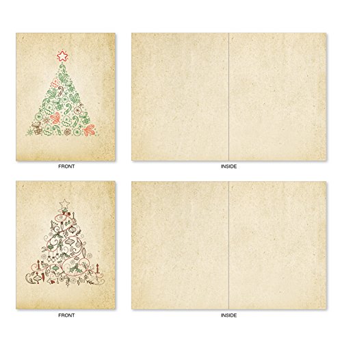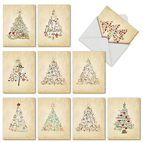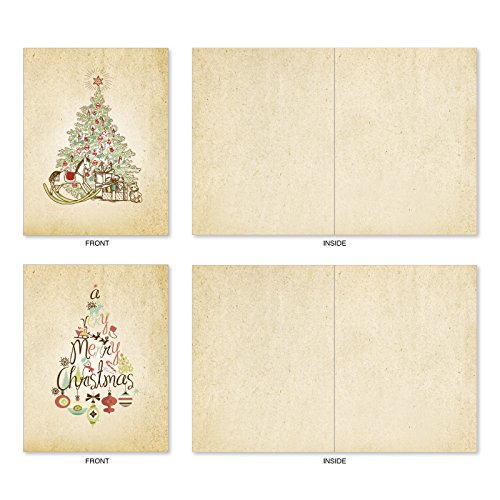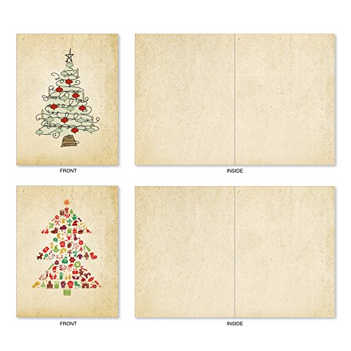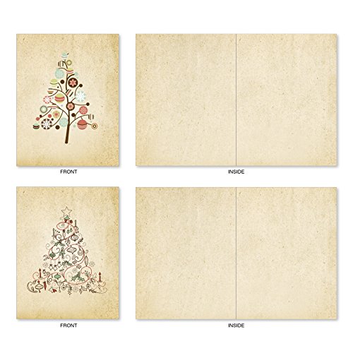 M6648XSB Retro Tannenbaum: 10 Assorted Blank Christmas Note Cards Featuring Various Christmas Tree Styles Selectively Hued with Retro Mid Century Color Palette, w/White Envelopes.