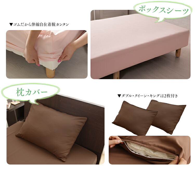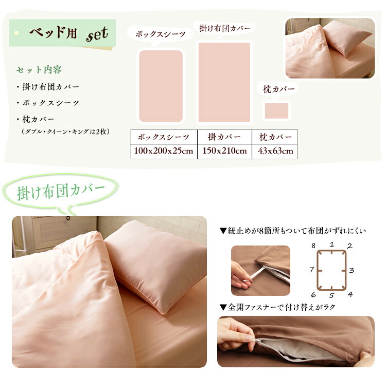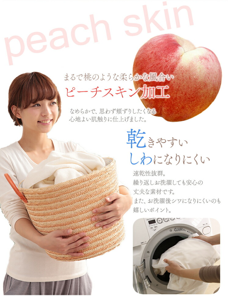 生地:ポリエステル100%(ピーチスキン生地)※掛カバー、敷カバー、BOXシーツ、枕カバー共通