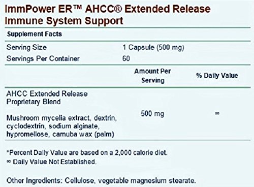 -. LegalDisclaimer : ImmPower ERTM AHCC® 60 Caps Dietary Supplement - Enhance Natural Killer Cell Protection* - Promote Optimal T-Cell and Macrophage Activity* - Prolonged Absorption of Active Ingredients* Sested Use: As a dietary supplement for adults, take one (1) capsule twice a day for general maintenance. For maximum benefit, take up to six (6) capsules per day. Supplement Facts Serving Size: 1 Capsule Servings Per Container: 60 Amount Per Capsule AHCC Extended Release ProP.R.Ietary Blend 500 mg Mushroom mycelia extract, dextrin, cyclodextrin, sodium alginate, hypromellose, carnuba wax (palm) Other ingredients: Cellulose, vegetable magnesium stearate ImmPower ER, AHCC extended release formula, should be used on the recommendation of a health professional. It is best to take ImmPower ER at least one hour away from other supplements and/or medication. KEEP OUT OF REACH OF CHILDREN. CONSULT A HEALTH CARE PROFESSIONAL FIRST IF YOU ARE PREGNANT OR NURSING.