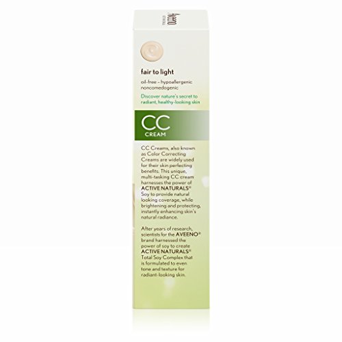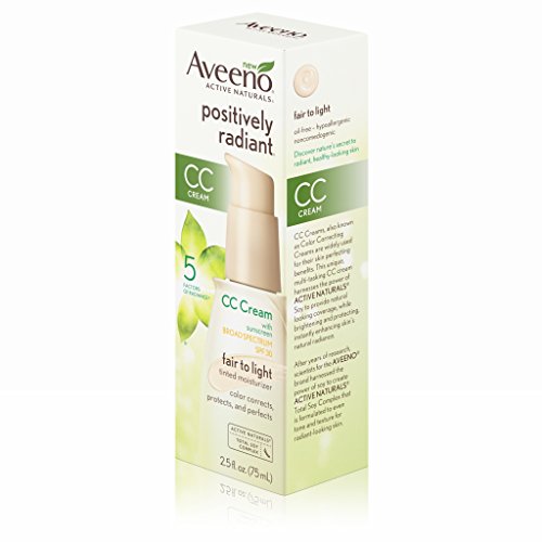 Aveeno Positively Radiant CC Cream provides instant, sheer coverage while evening tone and texture and offering broad spectrum SPF 30 sun protection. For fair to light skin tones, this sheer daily moisturizer is shown to improve tone, texture, dullness, blotchiness, and brown spots. The luminous formula contains Active Naturals Total Soy Complex for radiant, healthy-looking skin. With natural light-reflecting minerals, this moisturizer blends away imperfections while protecting skin from sunburn. This oil- free daily moisturizer is non-comedogenic and hypoallergenic.Feature
