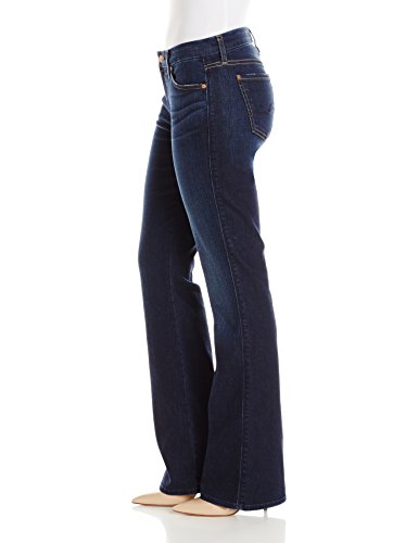 Dark bootcut jean in 10-ounce stretch denim featuring whiskered hips and five-pocket styling with signature squiggle embroidery on seat