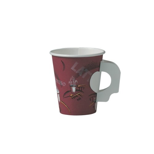 This SOLO 376SH-0041 disposable 6 oz. paper hot cup with handle and Bistro print has a polyethylene lining for resistance to leaking and moisture penetration, and a rolled rim for rigidity and strength. It is suitable for serving coffee, tea, hot chocolate, and other hot beverages. This paper cup has a handle for gripping and protection of hands from heat generated by hot beverages, and withstands beverage temperatures up to 205 degrees F. It is 3.2" high, has a 2.9" diameter, and is compatible with a SOLO VL36R-0007 lid (sold separately).