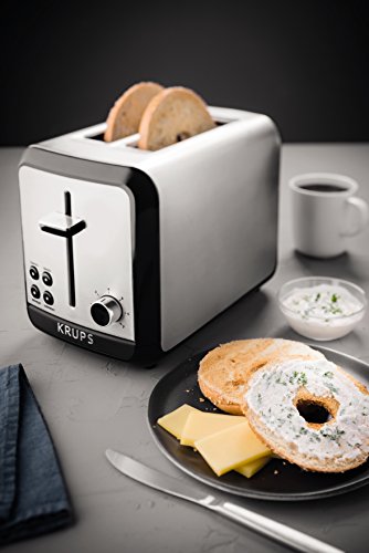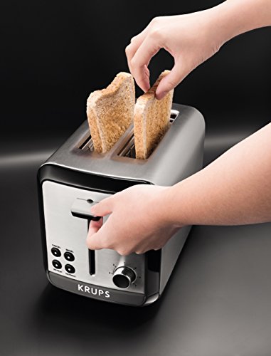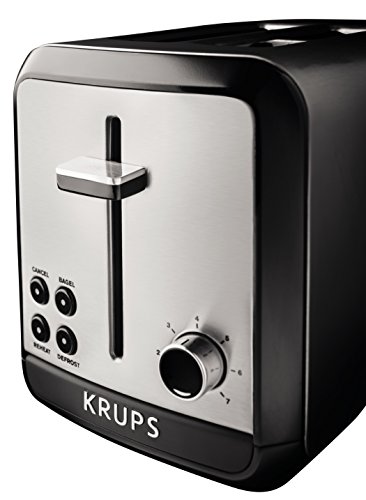 Toast bread to crispy perfection every time with the KRUPS KH311050 Savoy two-slice toaster. The high-quality toaster offers six different levels of browning to accommodate individual preferences, and its extra-deep slots fit bagels, buns, English muffins, and even thick slices of homemade bread. Use the safe lift function to easily and safely remove smaller pieces that can be hard to reach. The KRUPS toaster offers four convenient functions: bagel, cancel, defrost, and reheat. Choose bagel mode to warm the outside and toast the cut side of bagels; defrost mode for toasting items like frozen waffles, toaster pastries, or toaster hash browns; reheat mode for warming without toasting; or the cancel function to end the session at any time. Housed in brushed stainless steel with black accents, the KRUPS KH311 Savoy two-slice toaster offers exceptional convenience on its own or as part of the matching KRUPS Savoy collection.Feature