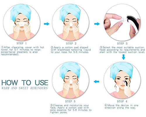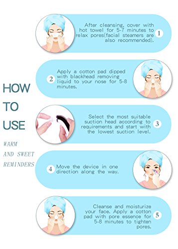How to get the best results? 1.Massage and clean the face with hot towel or facial steamer to make skin pores completely opened ensuring blackhead can be cleared out effectively. We also recommend using facial lotion which can help open skin pores effectively. 2.Select the suitable suction probe. 3.Choose and test with the lowest suction level.Move the device in one direction along the way.It's recommended not to place it in the same place for two seconds. 4.Clean and moisturize your face to tighten skin. NOTE: This device is not recommended to use on sensitive skin. 0