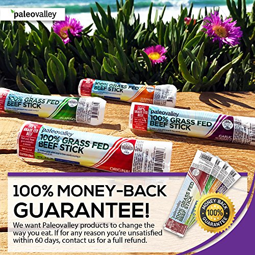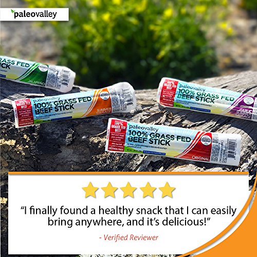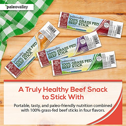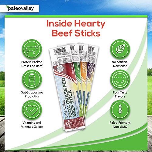 Paleovalley 100% Grass Fed Beef Sticks Picky eaters who also follow a Paleo or similarly clean diet can rejoice with this 10-pack. Choose between four flavors (Original, Jalapeno, Summer Sausage, and Garlic Summer Sausage). All are flavored with organic spices and made of 100% grass-fed and grass-finished beef, making it more nutrient rich (with up to four times more Omega 3s), and free of artificial hormones and other ingredients.