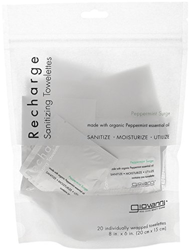 Ever have one of those days? You're out and about or you're in at the gym, or wherever. Giovanni towelettes recharged, relax, refresh whatever! Clean up, wipe up, lift up your spirit with towelettes dressed in organic essential oils. They're lightweight, soft as a cloud and antibacterial. Perfect for hands, feet or legs.Feature