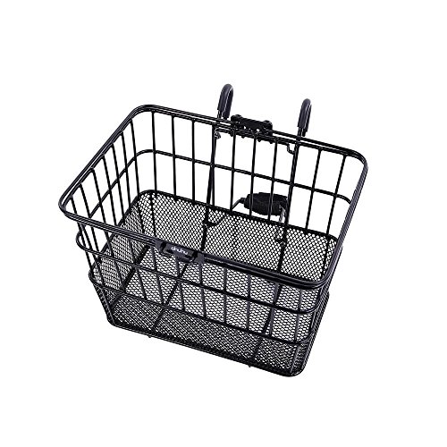 Product Description: This mesh bottom bicycle basket can either be installed to bicycle, or be carried on arms as a shopping basket. It is easy to install and uninstall without any tools, and fits for most almost all handle bars. Special plastic coated design makes it water proof and rust proof. It is indispensable part of your bicycle.