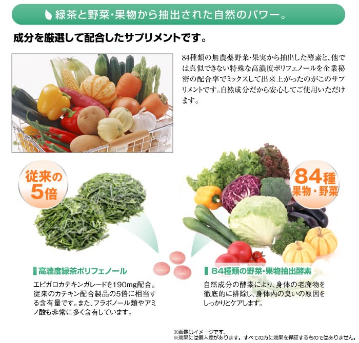 | 成分 | 白糖、乳糖、セルロース、炭酸カルシウム、増粘剤(アラビアガム)、グリセリン、脂肪酸エステル、ゼラチン、タルク、セラック、ベニコウジ色素、緑茶抽出液・野菜果物抽出エキス(オレンジ・キウイフルーツ、モモ、リンゴ)ビタミンC、オリゴ糖、ビタミンB1、ビタミンB2、ビタミンB6、光沢剤 |
