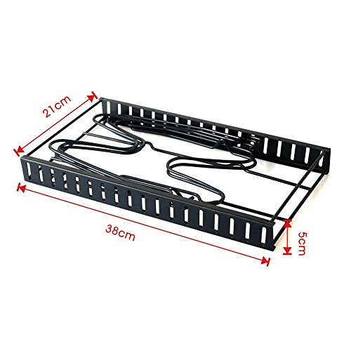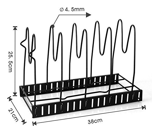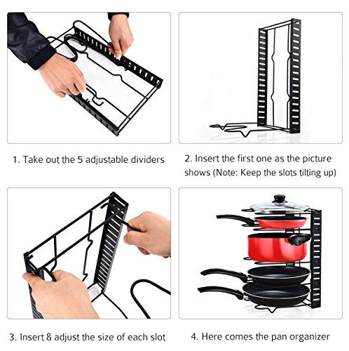 1.Remove all of the packing material from the organizer rack. 2.Separate the shelves from the base. 3.Insert the ends of the shelf into the slots of the base by squeezing the sides.Place the shelves apart according to the desired pan/lid/size. 4.Make sure to install the shelf with "feet" on the end of the base. 5.The rack is designed to hold 5 pans or lids. 6.You can either lay it flat or place the rack upright (best for base cabinet or pantry). 7.If placing upright,make sure that the bottom shelf is using the slot closest to the edge and has to be in contact with the surface.see diagram. About Cleaning To clean,simply wipe with damp cloth