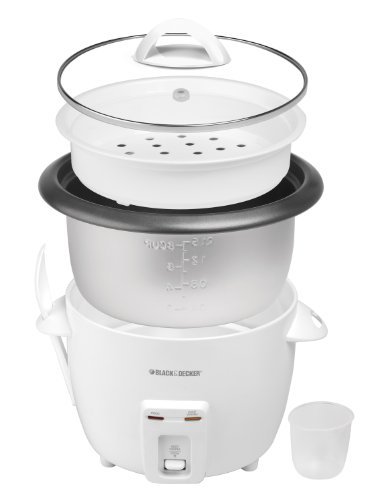 This black and decker 14-cup rice cooker and steamer has cook and warm indicator lights to advise when rice is cooking and when cooking is complete. It automatically switches to a lower heat once rice is cooked.