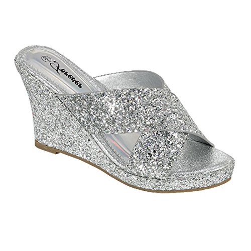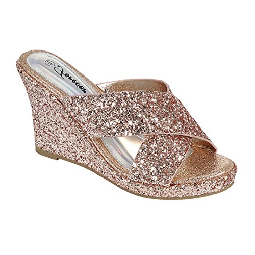 Product DescriptionThese wedge sandals are featuring criss-cross strap at vamp, glitter upper, platform, finished with a high wedge heel.0