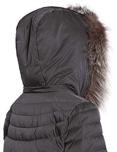 This coccoon shaped down coat is accented with a detachable genuine fur trimmed hood. This ultra-warm down has a flattering stand collar and chunky knit ribbed cuffs at the sleeve.Feature