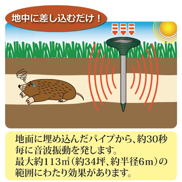 発生する音波振動は、約113平方メートル(約34坪、約半径6m)の範囲に伝わり、モグラを驚かせます。約25~30秒の間隔で土中に約3秒間、モグラが嫌う音波振動を発生します。薬剤等と違い、人・動物・植物には無害です。ソーラーパネルで太陽光エネルギーをバッテリーに充電して稼動します。