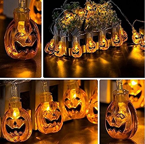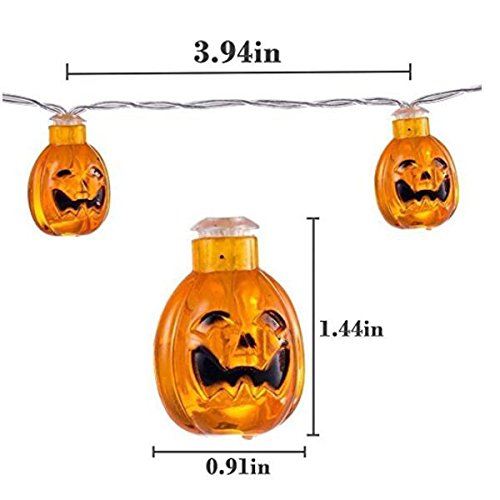 -. Feature : A string of 20 small pumpkin, voltage 4.5V, light source power 0.03 (w). / Decoration String Lights includes 10 counts 3D pumpkin lantern shaped light shells. Each one contains 1 incandescent mini light. Rich orange glow. It is a great funny stylish design for Halloween or other festival decor. / Product specifications: the total length of each set of 2.2M, pumpkin and pumpkin spacing between 10cm, battery box extension cord 30cm, each set of lights equipped with a 3 AA batteries with flashing function of the battery box / Distinctive smiling face pumpkin shaped add a Halloween spirit to any rooms. So easy to create "festival atmosphere" anywhere. Recreate the lively ambience in just minutes which make you feel happy. It is also easily to hang up and sparkle so well and glow cute and special light to your house. Your home decoration will become alive when you add the light wires on forgotten corners of your home. / Perfect for indoor decoration or other outdoor party or patio celebration occasions. You will be able to benefit of their light fairy effect on Festival, especially Halloween, or celebrations, to enhance the flower bouquets, tables, and ceilings.
