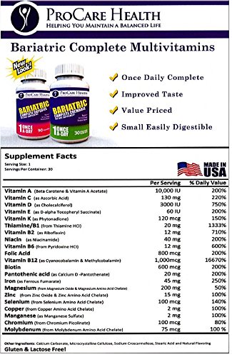 -. Binding : Health and Beauty -. Brand : ProCare Health -. Color : Wheat Yellow -. EAN : 0639713545777 -. Feature : Meets or exceeds all ASMBS guidelines! / Only ONE capsule per day! / Save over 45% compared to competitors! / Manufacturing Process - Full GMP Compliance since inception / Small, easy to digest -. IsAdultProduct : 0 -. Label : ProCare Health -. Manufacturer : ProCare Health -. PackageQuantity : 1 -. ProductGroup : Health and Beauty -. ProductTypeName : HEALTH_PERSONAL_CARE -. Publisher : ProCare Health -. Studio : ProCare Health -. Title : Bariatric Once-A-Day Multivitamin 90 Ct Capsule- Made for Gastric Bypass Sleeve WLS Surgery -. UPC : 639713545777