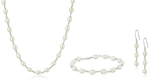 Sterling Silver and White Freshwater Cultured Pearl Bracelet, Necklace, and Earrings Jewelry Set