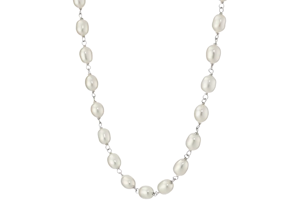 Coordinating necklace, bracelet, and drop earrings crafted from sterling silver links studded with cultured pearls