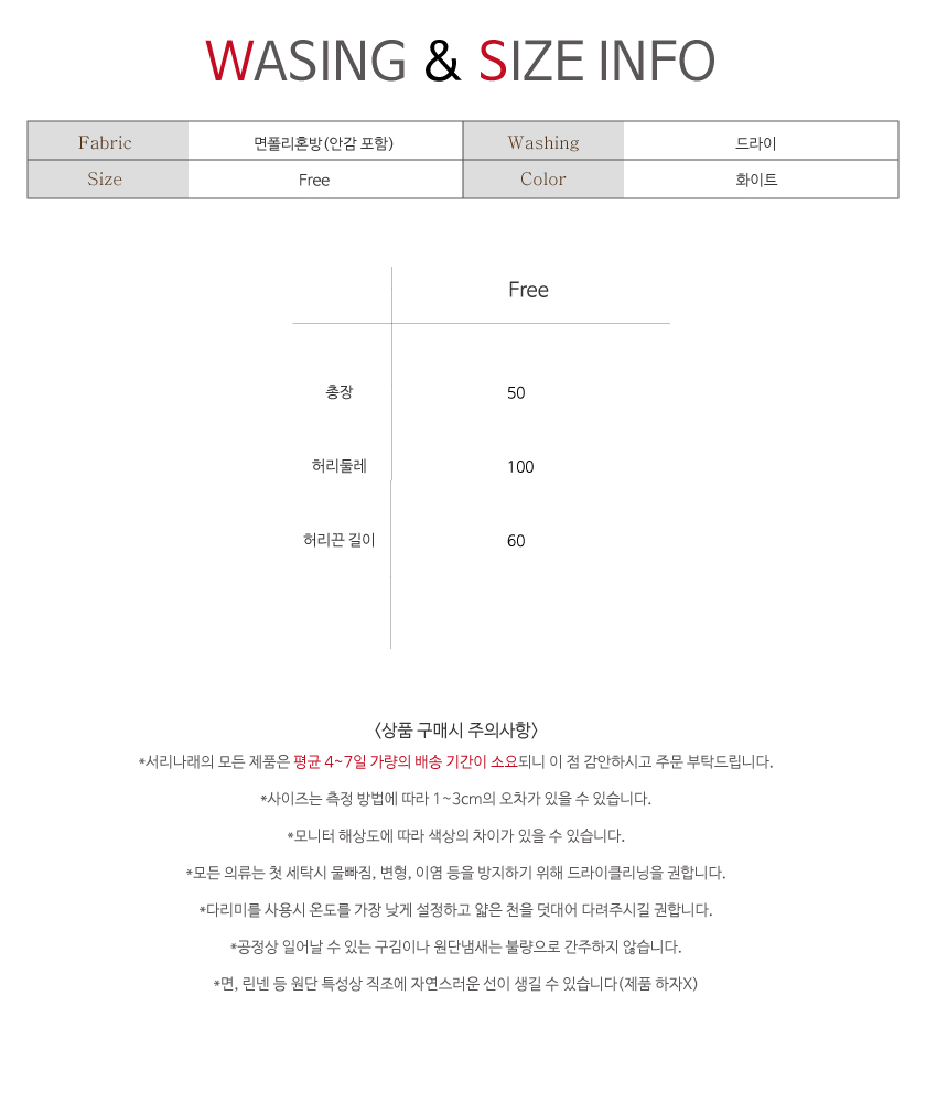*코디 제품:포카리 셔츠 저고리 티없이 맑은 순수한 느낌의 화이트 허리치마 주름이 예쁘게 잡혀있어 조금 긴 테니스 스커트 느낌도 나는 제품이랍니다 면+폴리 혼방을 사용해서 더운 여름철 입기에도 적절하고, 일반 면을 사용한 원단보다 구김도 훨씬 적은 편이랍니다. 스판성도 강해 허리를 단단하게 조이셔도 불편함 없이 착용하실 수 있답니다. 화이트 색상으로 단화나 기본 구두에 매치해도 좋고, 발랄하게 운동화와 코디해도 아주 잘 어울린답니다.