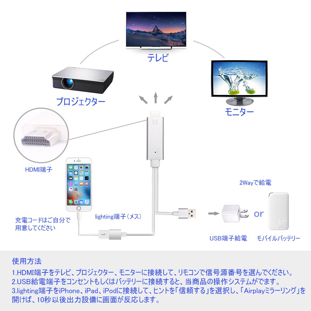Connect the iPhone code to the product with the power supply for the smartphone or the mobile battery as the power supply.