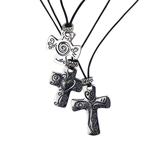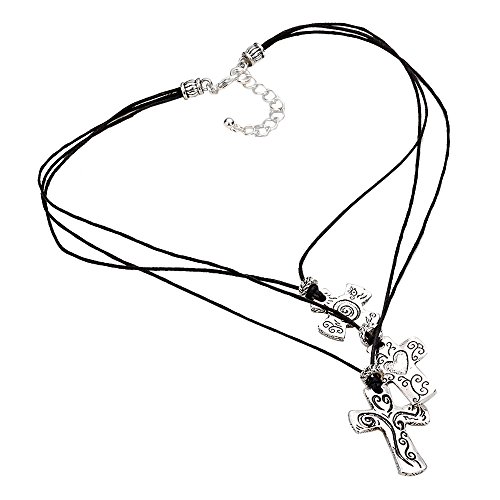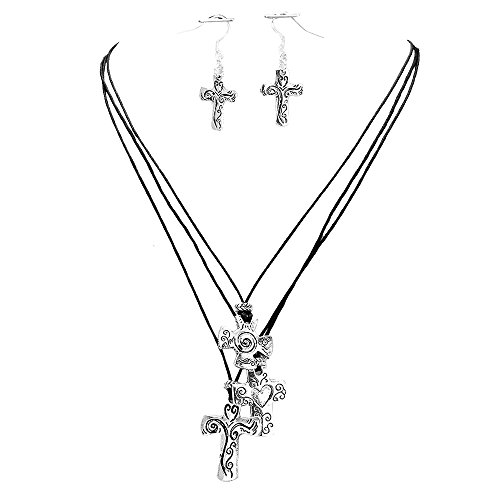 -. Feature : Necklace features 3 styes of highly detailed, decorative silver tone crosses / 16 inch necklace plus 2 inch extender chain and lobster clasp / Matching silver tone French wire dangle earrings, 1.5 inch length / Triple strand, black faux leather necklace with a lobster clasp / Packaged in a gift box