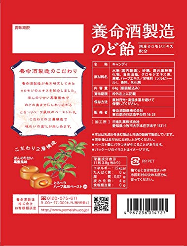 原材料:水飴(国内製造)、砂糖、還元澱粉糖化物、食用油脂、クロモジエキス末、黒蜜、ハーブエキス/甘味料(ソルビトール)、香料、乳化剤