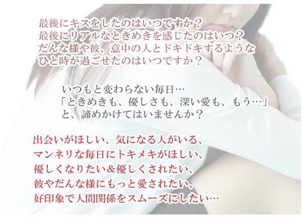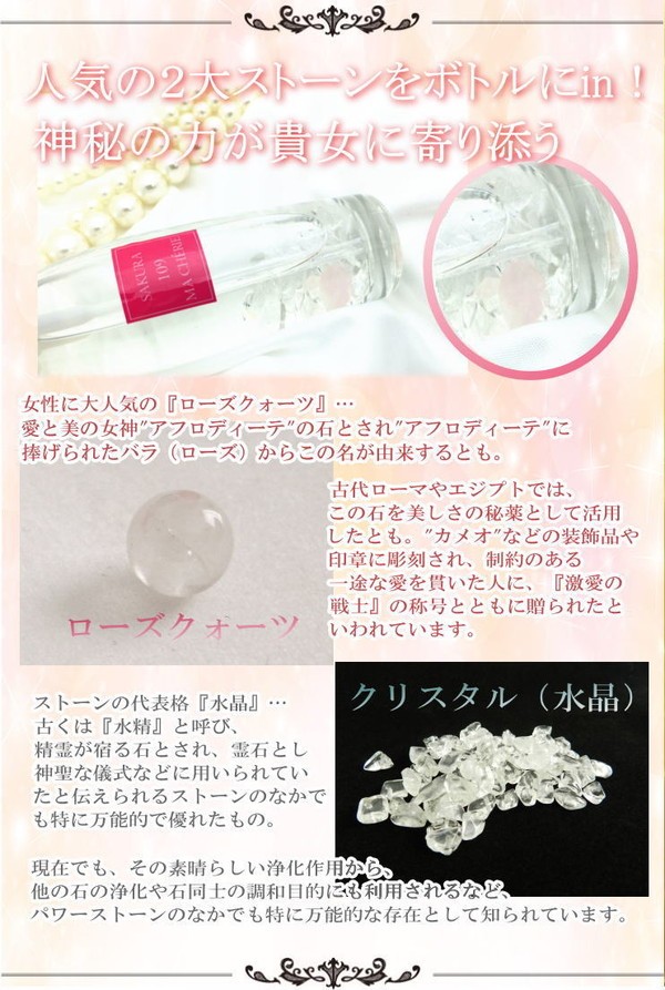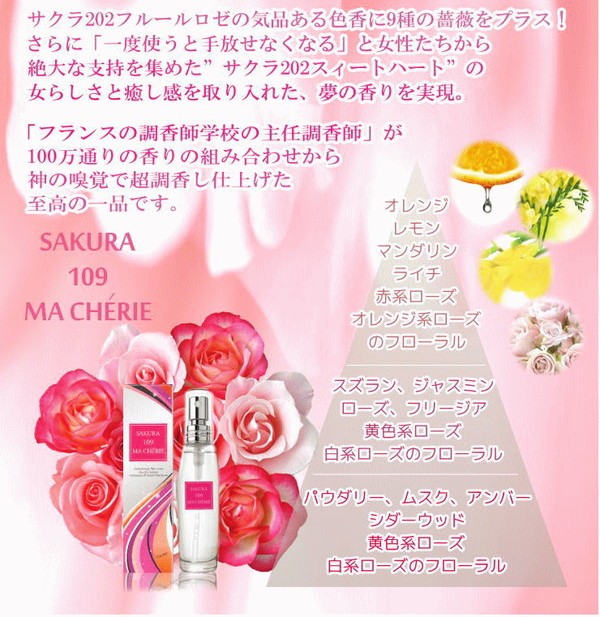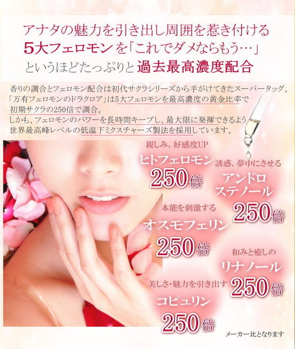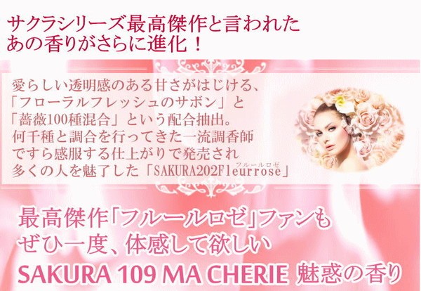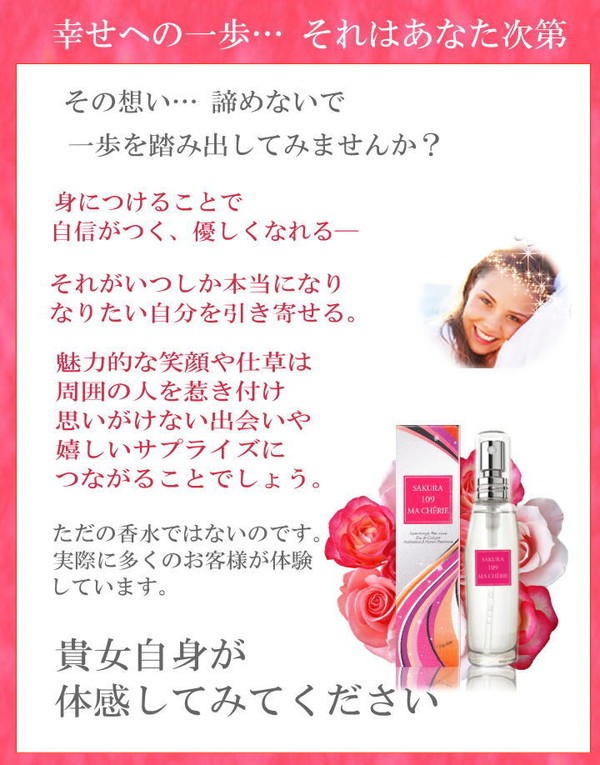 | SAKURAシリーズ最高傑作と言われる あの香りが進化! 貴女の未来を変えるかどうかは…貴女次第。 シリーズ最強と言われたあの香りがさらに進化! 世界中から集めた109種類の薔薇と、過去最高濃度配合の5大フェロモンに、2大天然石のパワーもプラス。 まさに至高の一品と言える香りは貴女の未来を変えてゆくかも知れません。 リアルな愛を求める女性たちにとって、これ以上の”特別なフレグランス”が存在したでしょうか!? 胸に秘めた、数々の想い・・・どうか諦めないで。 幸せへの一歩を踏み出すかどうかは、貴女次第です。 |