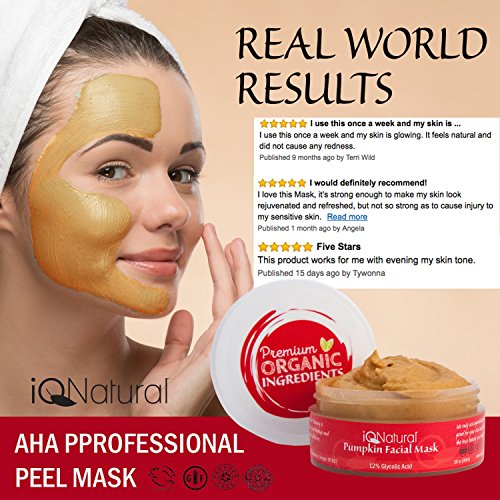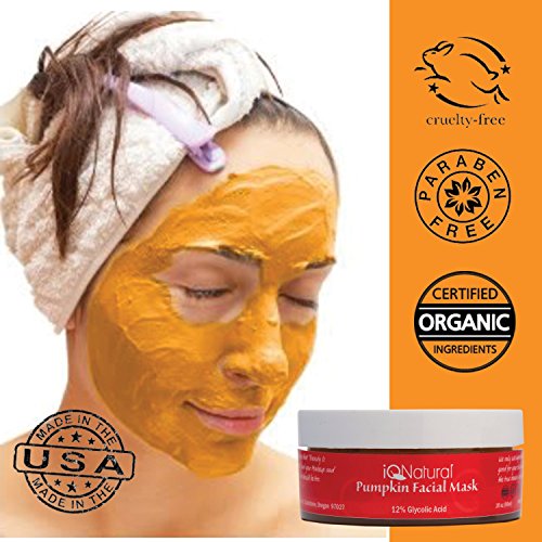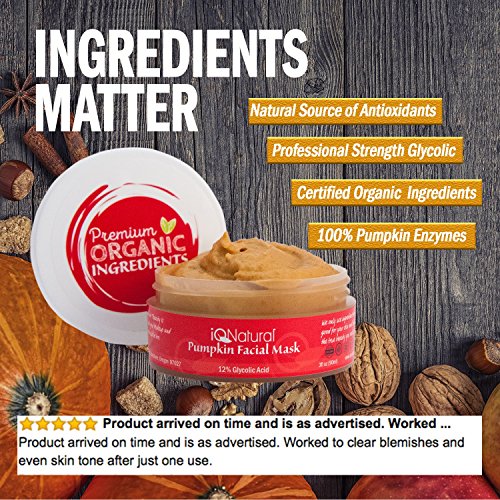 iQ Natural's Enzyme Pumpkin 5% Mask 4oz: Pumpkin is a rich natural source of Antioxidants and Enzymes with Alpha-Hydroxy acid capabilities. It has been known for years that Alpha-Hydroxy Acids promote smoother younger looking Skin by increasing the rate of cell renewal and removing dead skin cells. Pumpkin contains over 100 beneficial nutrients that help to reverse the signs of aging. Our organic face mask Pumpkin Peel will rejuvenate your face, hands, body and feet. The Glycolic Acid in our mask transforms dull lifeless complexions into youthful, radiant skin that glows. Pumpkin Peel brightening mask containers 5% Glycolic Acid that allows you to get a Professional Peel in the comfort of your own home at a price you can afford. This spicy, gentle exfoliating mask is one of our most popular products, and it's no wonder why. It's helped so many of our customers, all over the world, reveal their youngest, healthiest skin in years.Feature