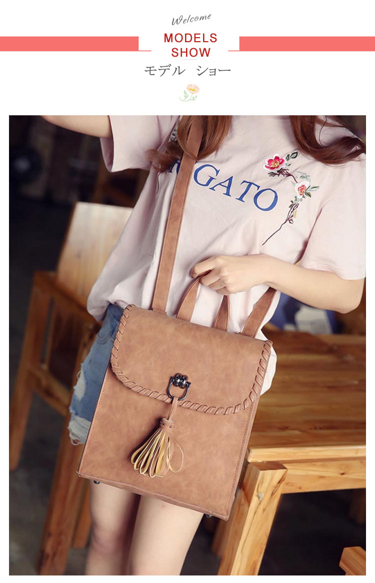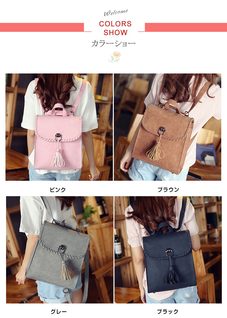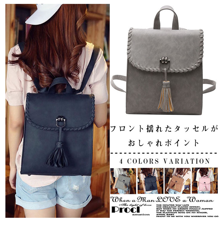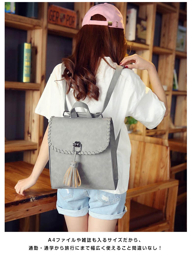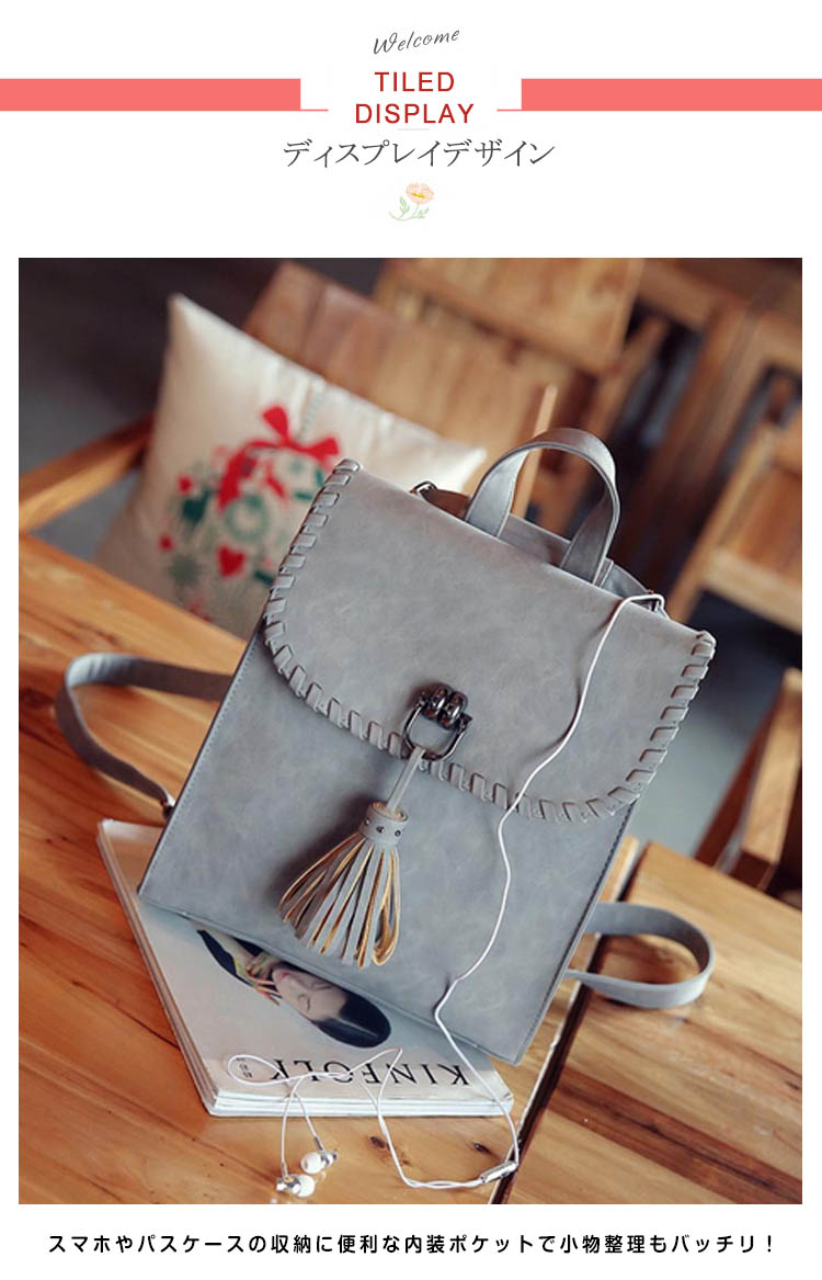 | フロント揺れたタッセルがおしゃれポイント。カジュアルになりすぎない大人のリュックサック!!A4ファイルや雑誌も入るサイズだから、通勤・通学から旅行にまで幅広く使えること間違いなし!カラバリも4色と豊富で、お気に入りの色をチョイスできます♪スマホやパスケースの収納に便利な内装ポケットで小物整理もバッチリ!シンプルなデザインがどんなコーデにもあわせやすく、大活躍間違いなしのアイテム! | |