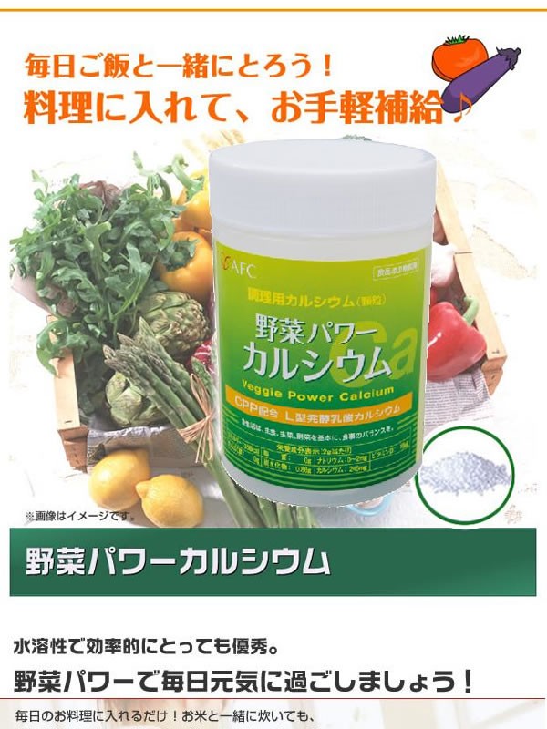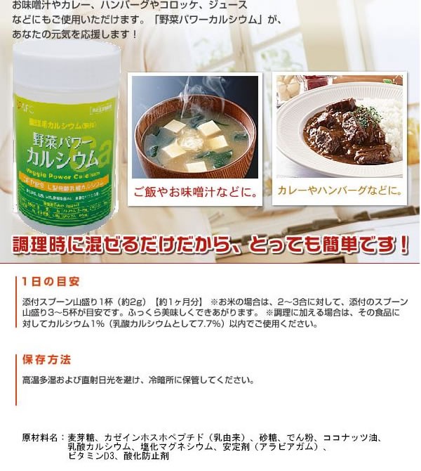 | 毎日のお料理に入れるだけ!お米と一緒に炊いても、お味噌汁やカレー、ハンバーグ、ジュースなどにもご使用いただけます。「野 菜パワーカルシウム」が、あなたの元気を応援します! |