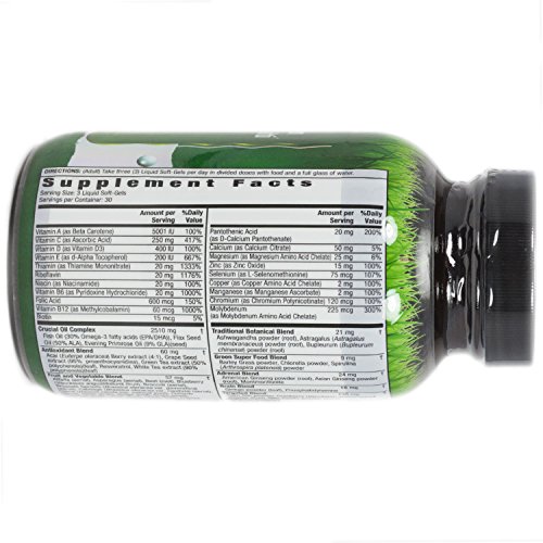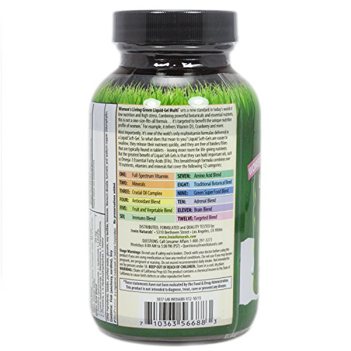Irwin Naturals Women’s Living Green Liquid-Gel Multi sets a new standard in today’s world of low nutrition and high stress. Using powerful botanicals from whole living plants, this is not a one-size-fits-all formula… it’s targeted to benefit the unique nutrition profile of women. For example, it contains Folic Acid, Omega 3 Oils and Cranberry. But most importantly, it’s one of the world’s only plant based multi-nutrition formulas that is delivered in a liquid soft-gel. So what does that mean to you? The nutrients in soft-gels are quickly released for use in your body, they’re easier to swallow and they do not contain binders and fillers found in tablets, so there’s more room for life-giving nutrients. But the greatest benefit of soft-gels is that they can hold special oils, such as Omega 3 Essential Fatty Acids (EFAs). This breakthrough formula combines over 100 nutrients, vitamins and minerals that cover the following 12 categories: ONE: Full-Spectrum Vitamins TWO: Minerals THREE: Crucial Oils FOUR: Antioxidant Blend FIVE: Fruit and Vegetable Blend SIX: Immune Support Nutrients SEVEN: Amino Acid Blend EIGHT: Stress Support Blend NINE: Green Super Foods TEN: Energy Nutrients ELEVEN: Memory/Concentration Nutrients TWELVE: Women’s Targeted BlendFeature