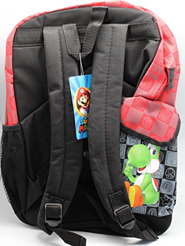 -. Feature : Super Mario backpack / Features a velcro close side pouch along with a mesh side pouch / Great for back to school / Contains three compartments in descending order of size / Measures 16in (40.5cm) tall, 12in (30.5cm) wide, and 5in (12.5cm) deep