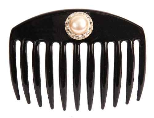 Caravan Hand Decorated French Comb with Large Pearl and Swarovski Stones In Silver Setting, Black, .65 Ounce