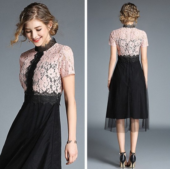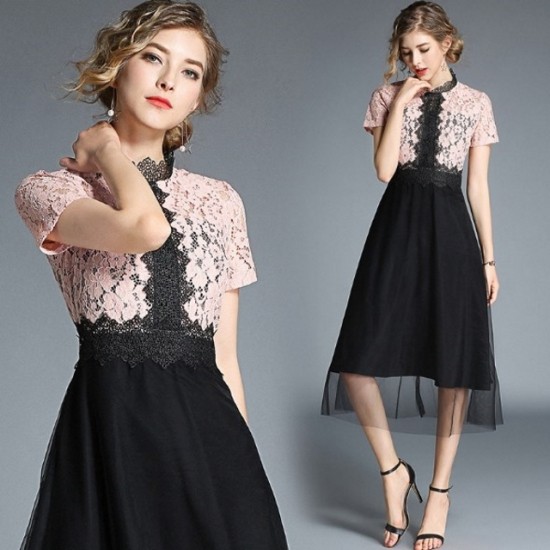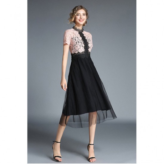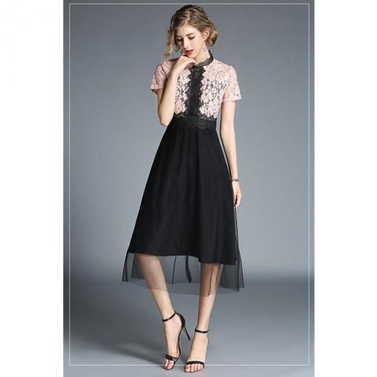 パーティードレス ミモレ丈 ワンピース レースライン ウエストマーク バイカラー チュール 半袖 大人 可愛い お呼ばれ drgz2599