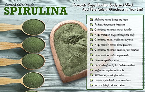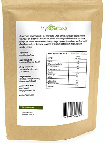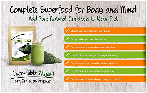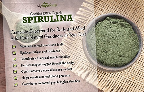 -. Feature : PACKED FULL OF NUTRIENTS: Spirulina Powder is one of the most nutrient-rich foods on the planet, packed with protein, vitamins, chlorophyll, iron, and calcium, forming part of a healthy diet that can even assist with weight loss / CERTIFIED ORGANIC: Our raw, non-GMO spirulina has been Certified Organic by the Soil Association. It is completely natural and contains no artificial colours or preservatives, and it is grown and harvested in a pure, sustainable and eco-friendly way / SUITABLE FOR VEGANS: This is a 100 percent vegan-friendly product. Despite the high calcium content, it has no dairy produce, and it is also gluten-free making it ideal for anyone on a vegan or vegetarian diet / HIGHEST QUALITY AVAILABLE: Spirulina powder comes in a range of concentrations, but MySuperFoods' Organic Spirulina Powder provides the most concentrated form available, packing more goodness into every spoonful / EXCELLENT CUSTOMER SERVICE: Enjoy the highest standards of customer service when you purchase from MySuperFoods. If you are unhappy with your purchase for any reason, we will be happy to refund your purchase in full