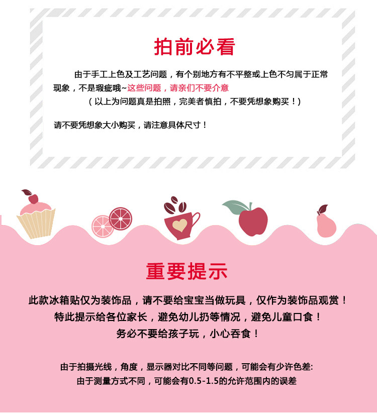 ②冰箱贴吸附在冰箱表面后请不要随意的冰箱表面滑动,正确的方式是先拿起冰箱贴再安置到对应的位置,切记不要滑动冰箱贴来移位,以免伤害到你的冰箱。
