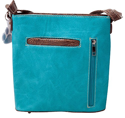 -. Feature : Made from high quality premium faux/imitation PU leather decorated with silvertone studs, blue conchos, colorful embroidered designs, laser cut tooled pattern on top and on trim, decorated with silvertone horse, and detachable HW Collection key ring/purse charm on the front / Single compartment fabric lined interior, front wall that has 2 open pouch pockets and a zippered wall pocket on inside rear / Zip top closure; 11 inches long X 10 inches tall X 3.25 inches wide / Carry concealed zippered pocket on the back (8 inches long X 7 inches tall) and an open pocket that can fit a 5 inch phone / Crossbody or over the shoulder adjustable strap