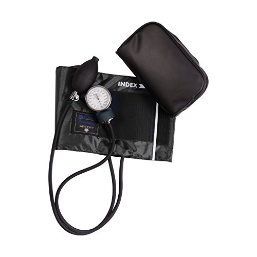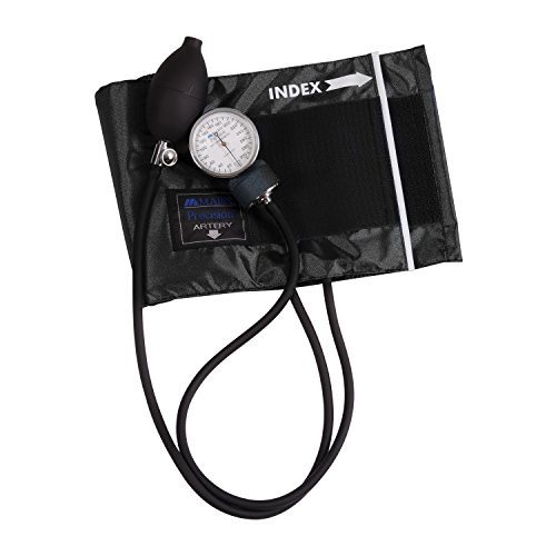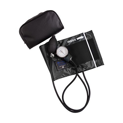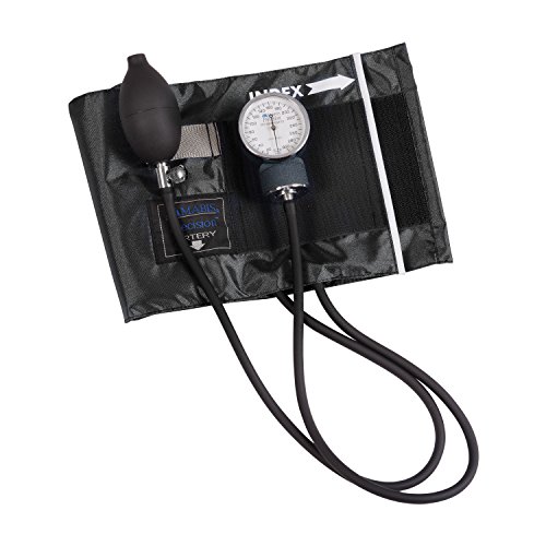 -. Feature : This professional quality MABIS LEGACY Series Aneroid Sphygmomanometer is similar to those used in doctors' offices and hospitals. It comes with all you need to start taking your blood pressure at home without the need for electricity or batteries. Easy! / Superior design. This sphygmomanometer features an easy squeeze inflation bulb that comfortably fits in your hand. The aneroid gauge shows large easy-to-read numbers, perfect for those with poor vision. You will enjoy its manual design to gain accurate results. / Convenient zippered carrying case ensures you will always have this handy blood pressure kit ready to go. Ideal for doctors, nurses, EMTs, other medical professionals and students! / Arm cuff comfortably fits arm circumferences between 11 and 16.4 inches. / INCLUDES: deluxe air release valve, inflation bulb, black nylon calibrated cuff, zippered carrying case and lifetime calibration warranty. Contains latex.