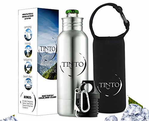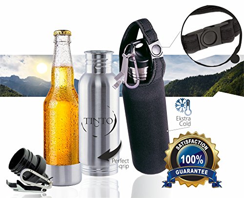 Stainless Steel Bottle Insulator by TINTO - NEW Design Bottle Holder + Insulated Bag + Bottle Opener + Carabiner - Fits Most 12oz Bottles