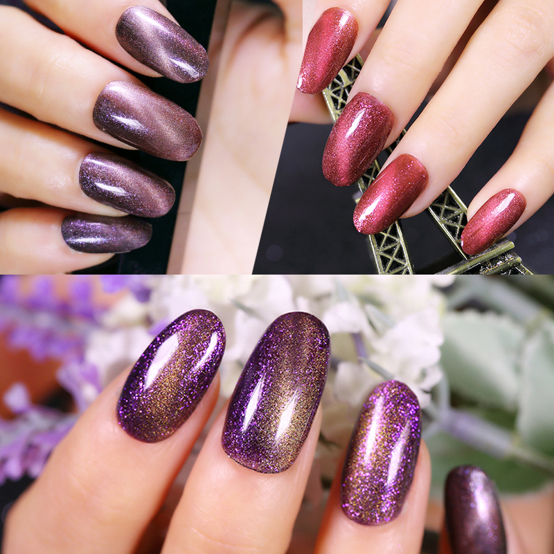 Attention Please:If you want to get the effect as picture show,you need to apply this gel on the black color before use Chameleon cat eye nail Gel