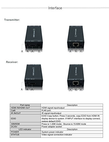 Transmits HDMI video and audio signals up to 60M over a single Cat6 cable; Support video resolution up to 1920*1080@60Hz, 3D signal; Support copy EDID, can match many kinds of display device; Support IR signal transmission; Support POC unilateral power supply Compliance with HDMI 1.3 and HDCP 1.2 standard; High compatibility, can auto-match source and display device;