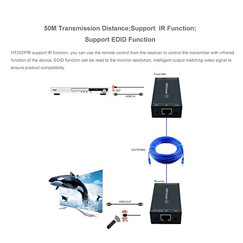 The HDMI extender provides extension of HDMI signals long distances over a single CAT6 cable, it supports high resolution up to 1080p, EDID copy function. The extender can use for a wide range of applications requiring long distance transmission of high resolution with high quality by its good stability and powerful security.